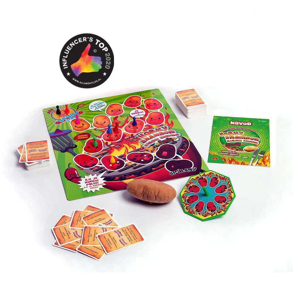 | Obsah hry | Hrací deska – 1 ks. Horký brambor – 1 ks. Karty s otázkami – 165 ks. Barevné figurky – 8 ks. Káča – 1 ks. Český a slovenský návod ke hře |