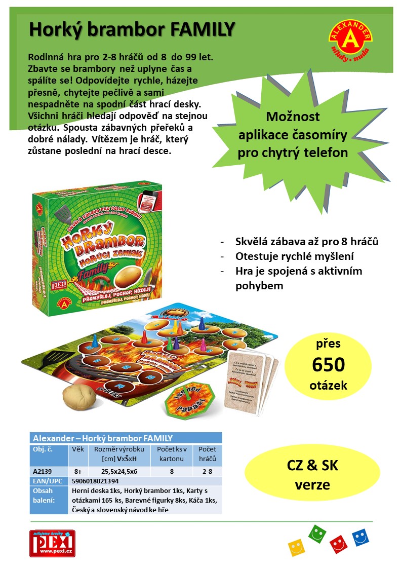 Nejlepší zábava od dob Člověče, nezlob se. Neskutečně živá rodinná hra s jednoduchými pravidly, kterou musíš zažít na vlastní kůži. Zábava pro 2-8 hráčů od 8 let do 99 let. Odpovídej rychle, házej přesně a zbav se brambory dřív, než dojde čas!