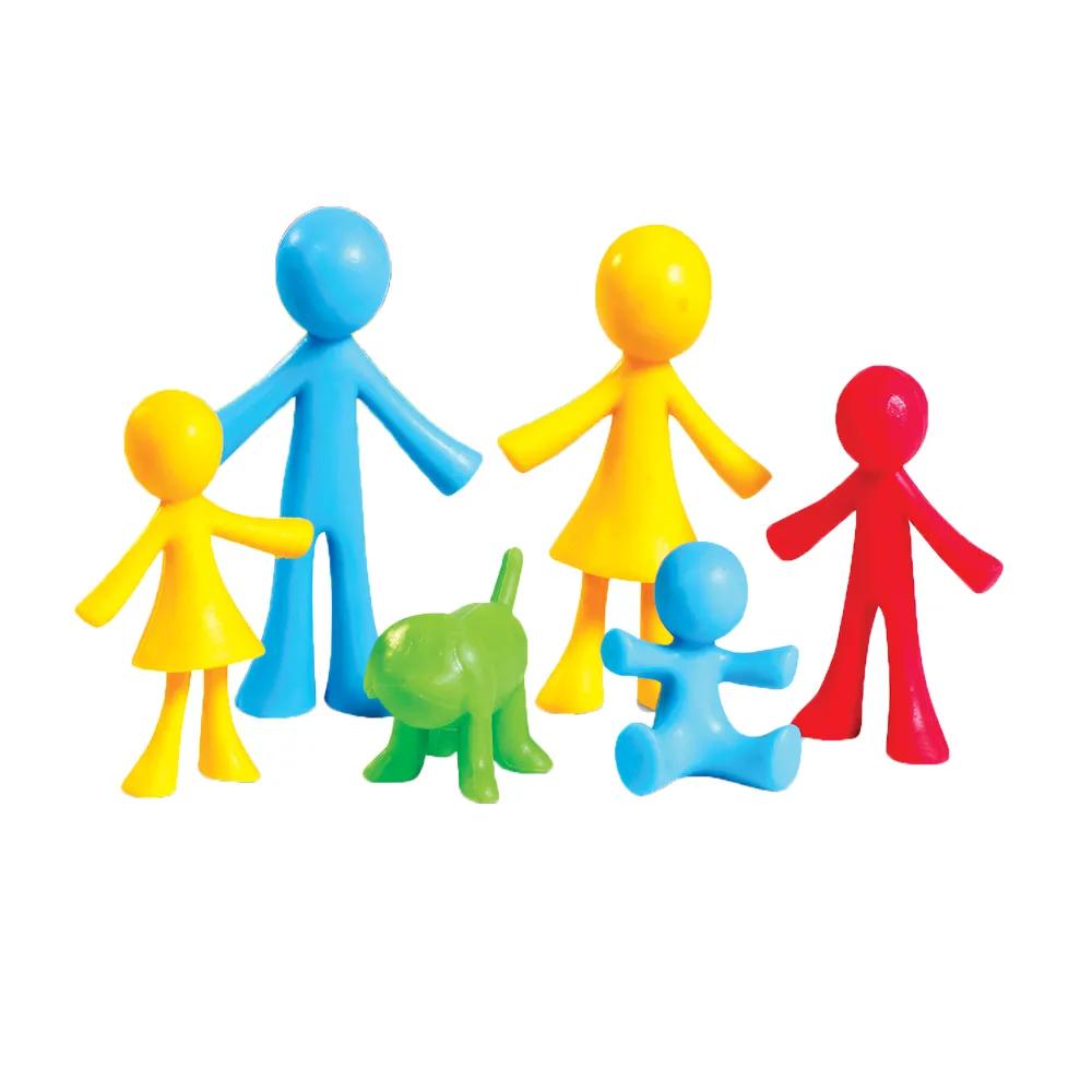 - Figurky představují šest členů rodiny, včetně domácího mazlíčka, ve čtyřech různých barvách.