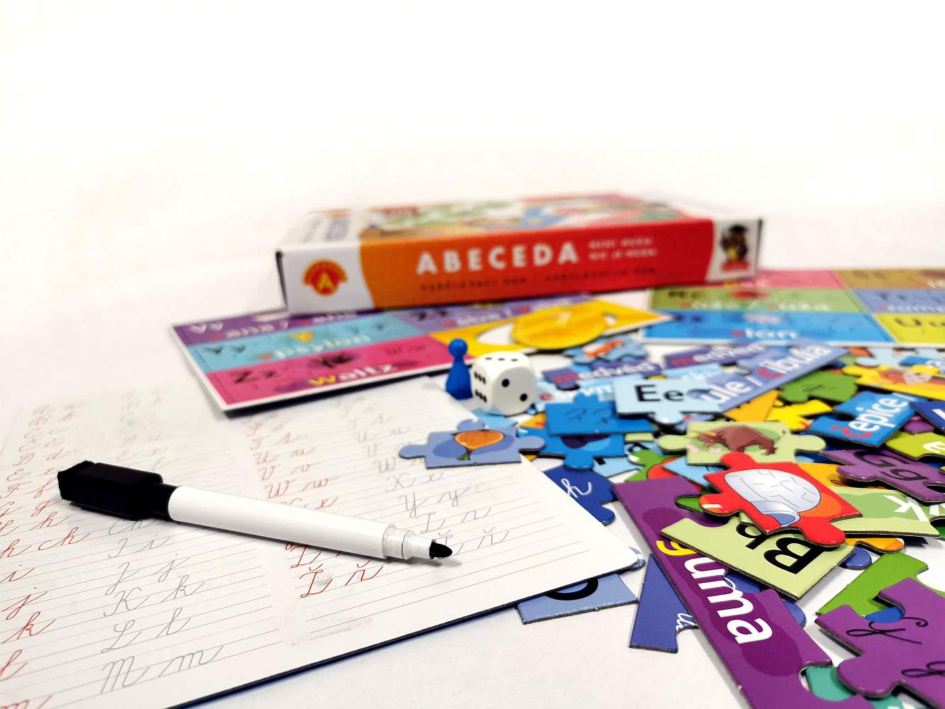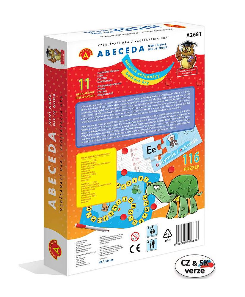 Celkem 11 zábavných her a aktivit pro děti od 4 do 8 let, které pomohou dětem od 4-5 let se popasovat s abecedou, jejím čtením a psaním. Ideální pro předškoláky a prvňáčky. Obsahuje také fixku se stírací tabulkou, na které mohou děti opakovaně trénovat správný úchop pera a zdokonalovat si poznávání a psaní písmenek. Hraní s Abecedou trénuje také postřeh a koncentraci. Balení obsahuje 163 dílů.